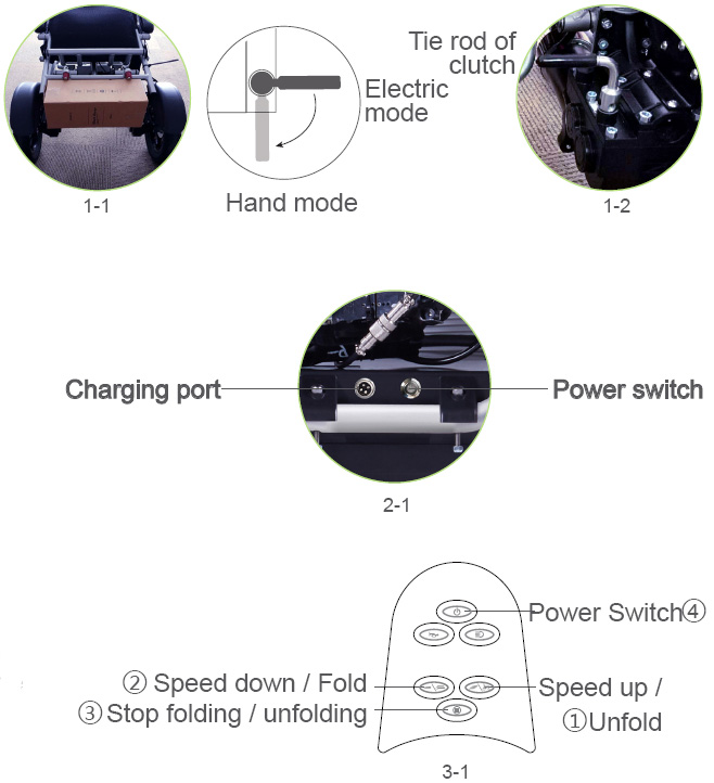 Take out the controller from the accessory box, make sure the main power on the battery box is turned on while the power switch on the controller is not turned on, then press and hold the folding key ① (see Picture3-1) for 3 seconds, release the button when the LED lights are on and there is a beep sound. Press and hold the unfold key ② for 3 seconds to unfold the wheelchair.Press key ③ to stop folding or unfolding.